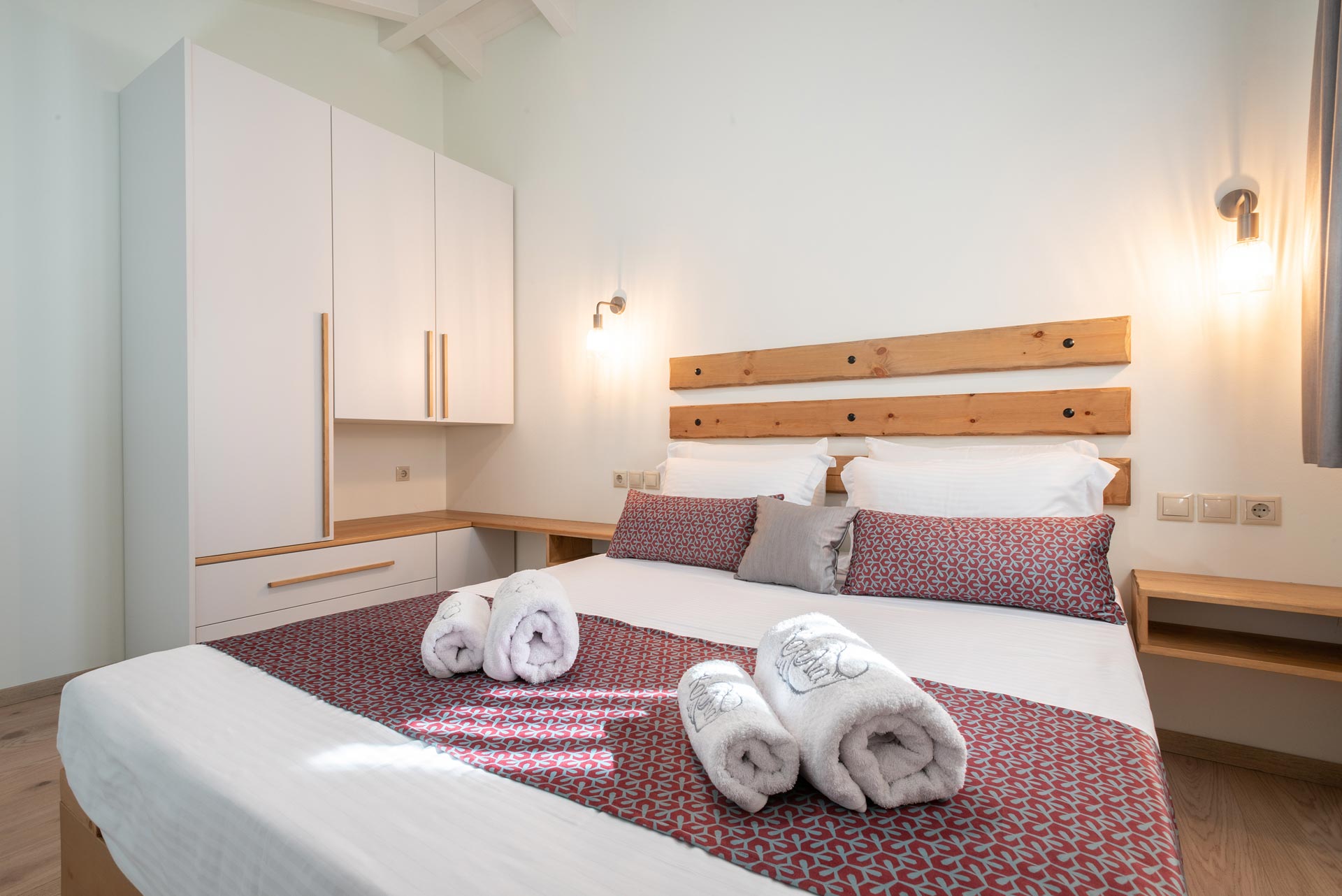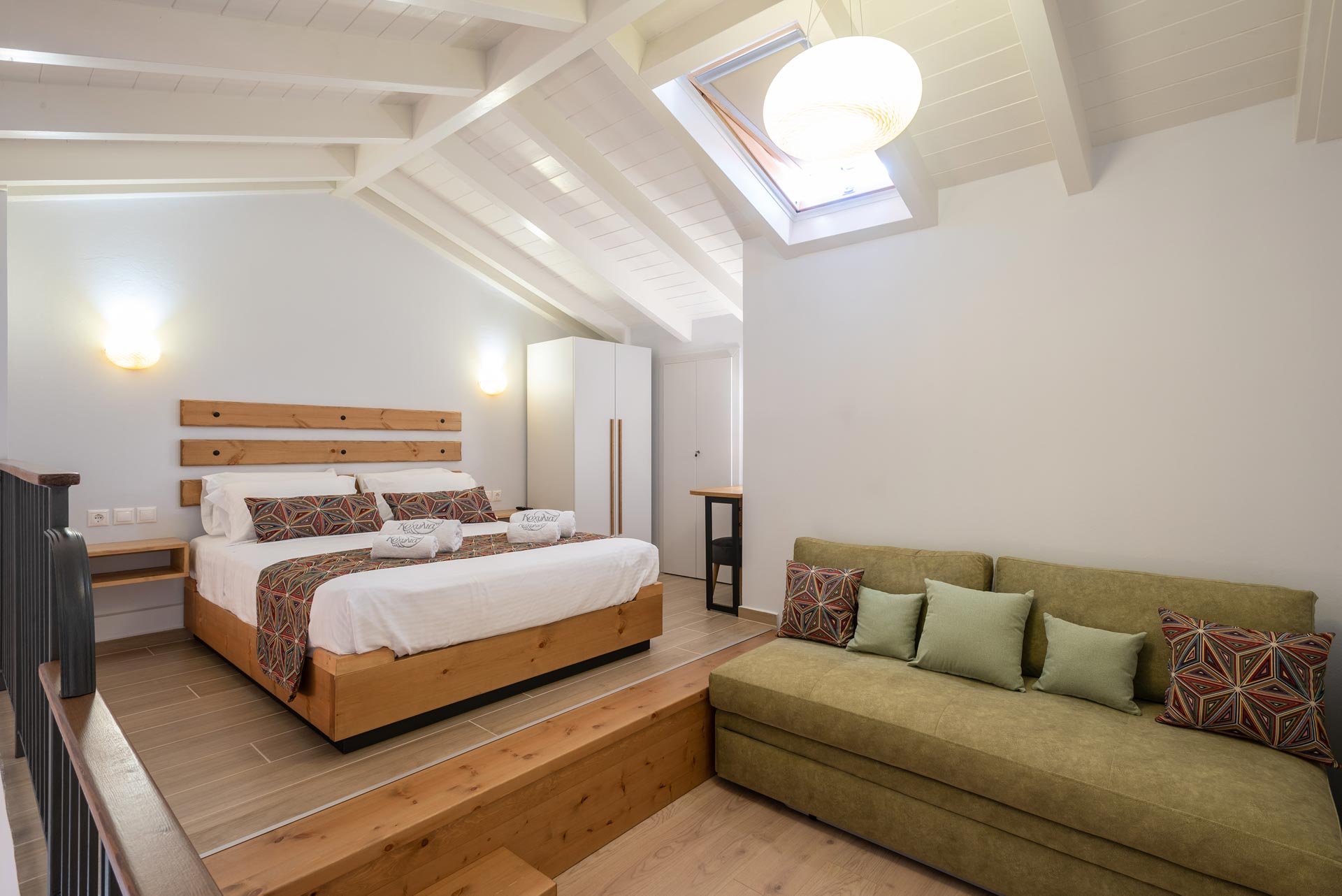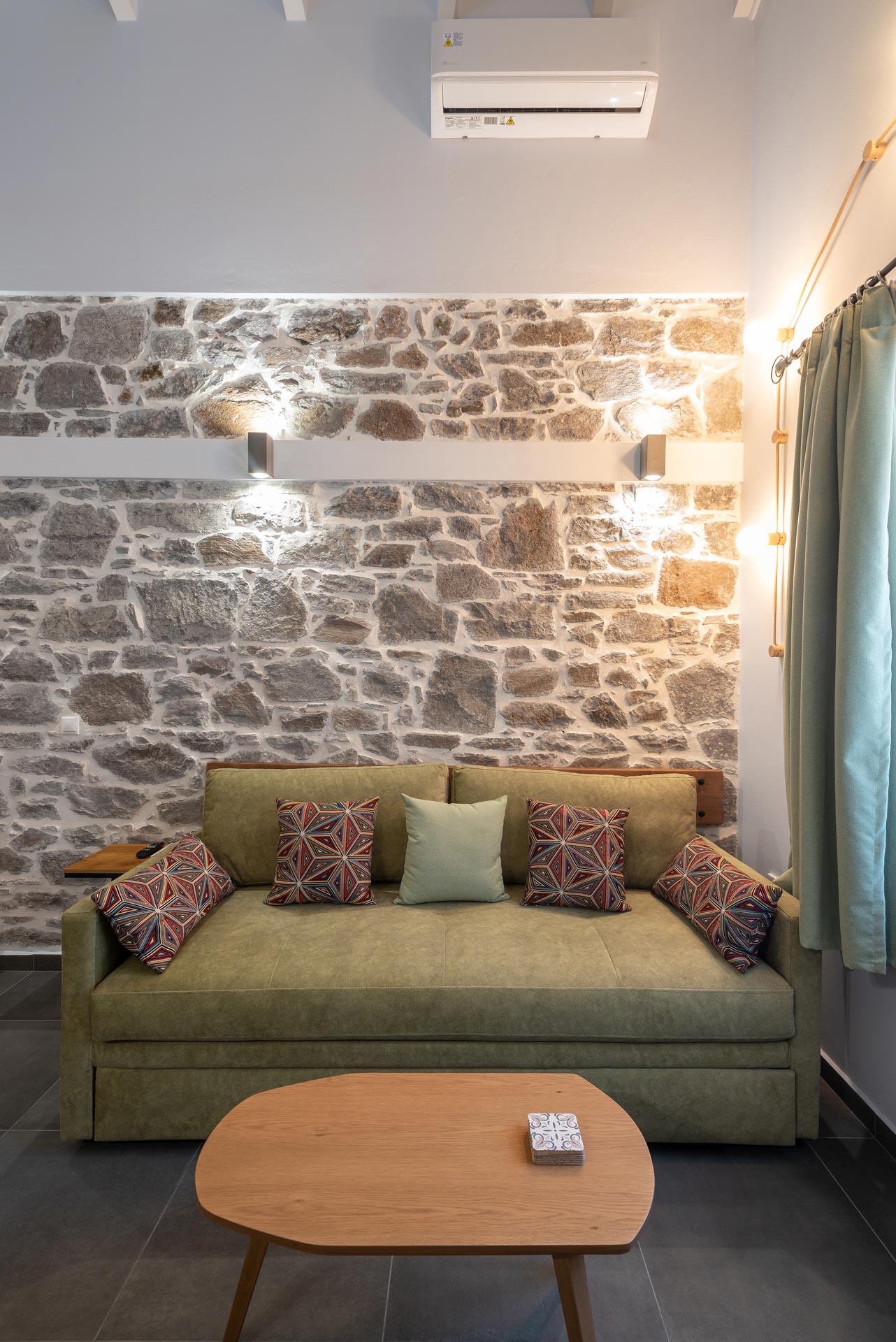 Smaragdia, in shades of green, can accommodate up to four people in one double and two single beds.