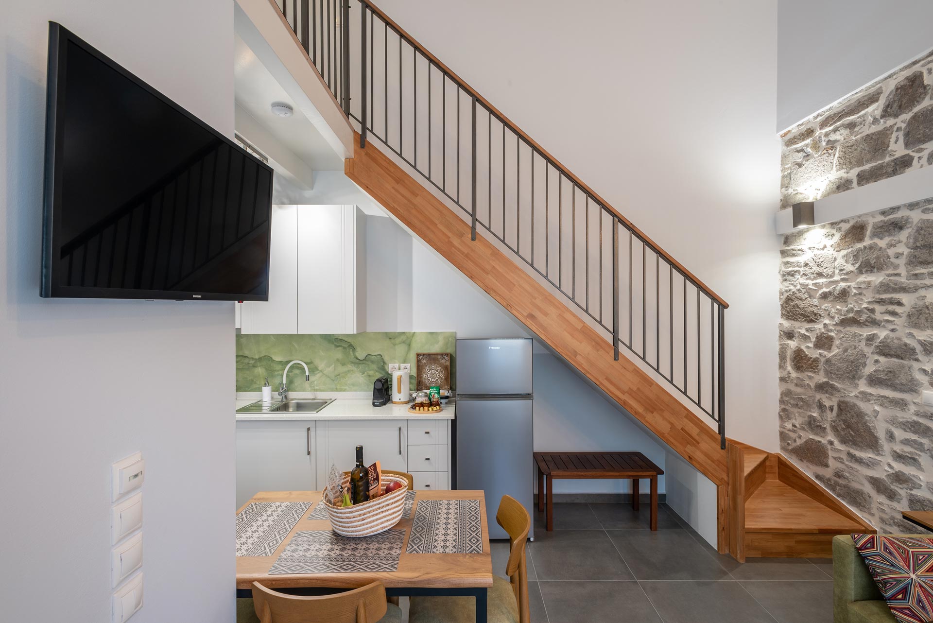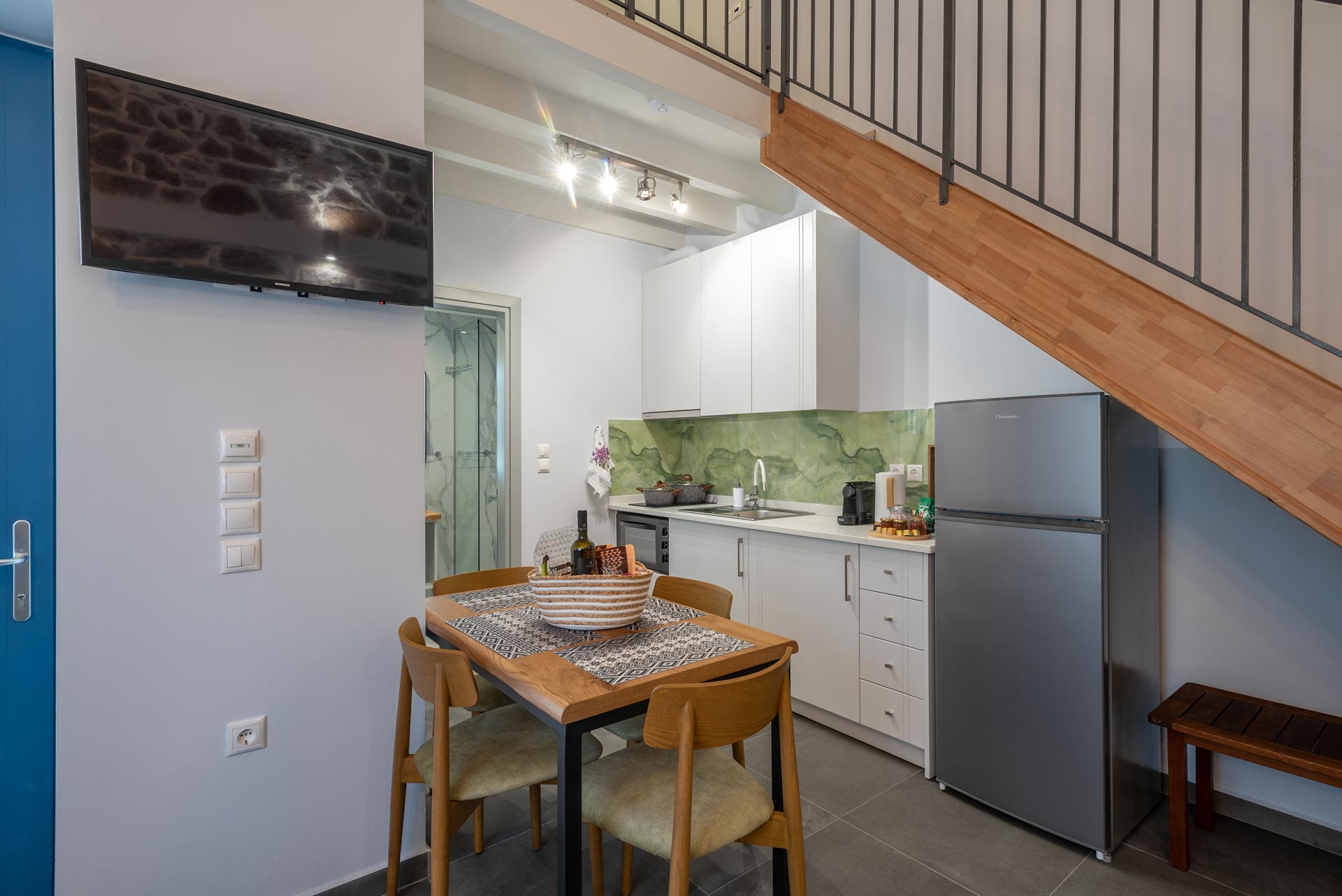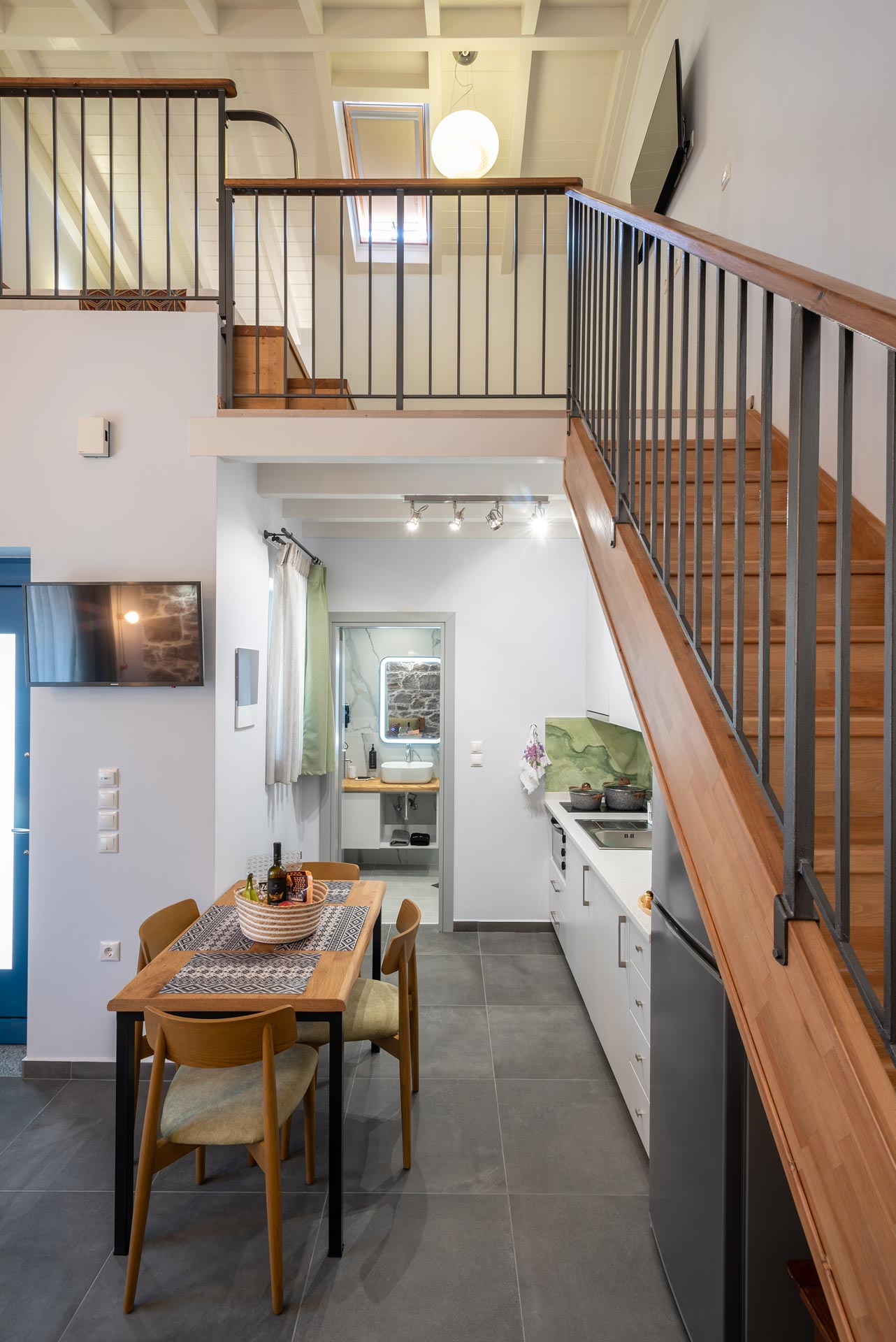 Internally the space is designed for a pleasant and comfortable stay. On the ground floor is the dining room, kitchen, toilet, large sofa, TV
