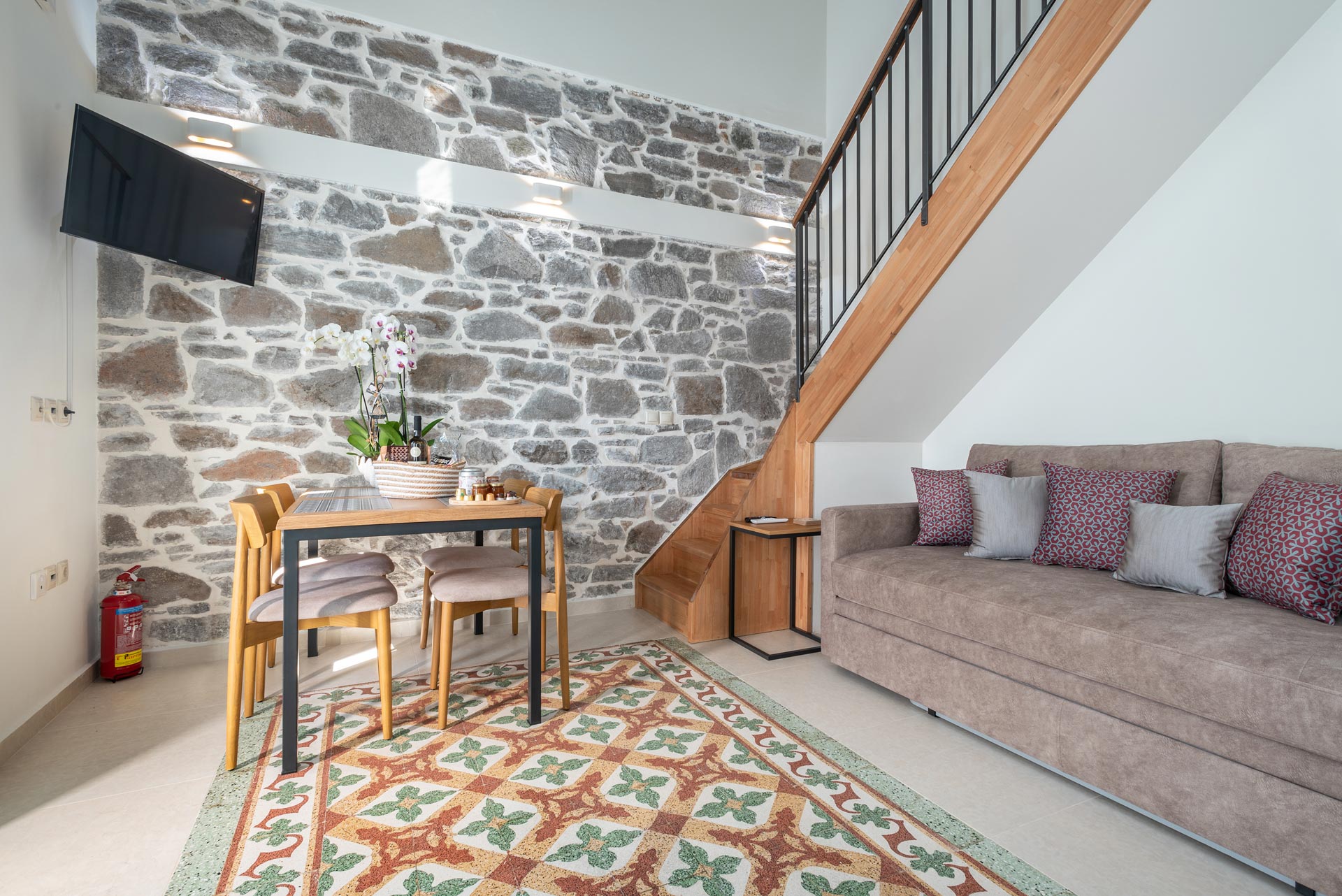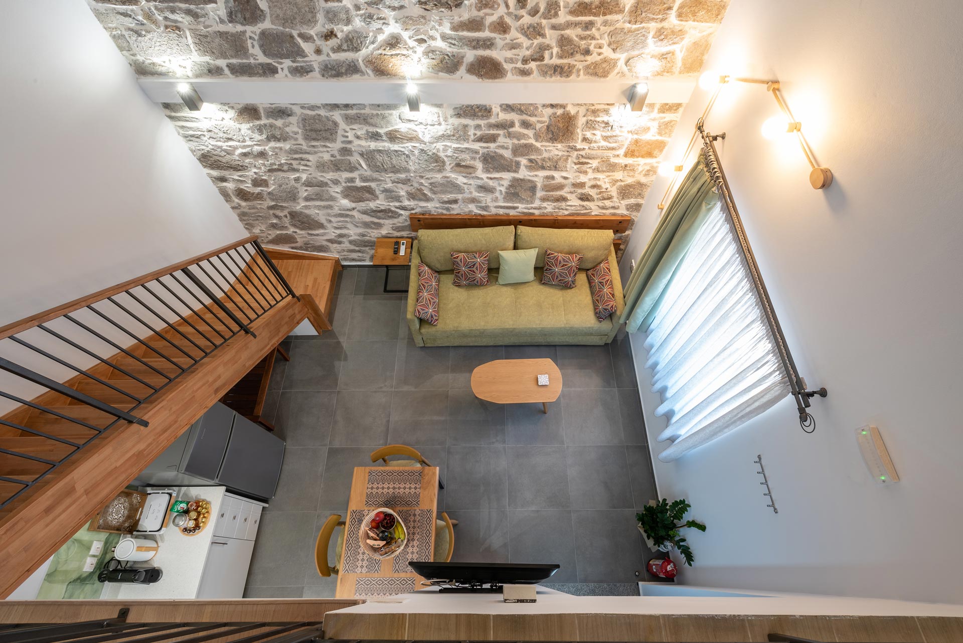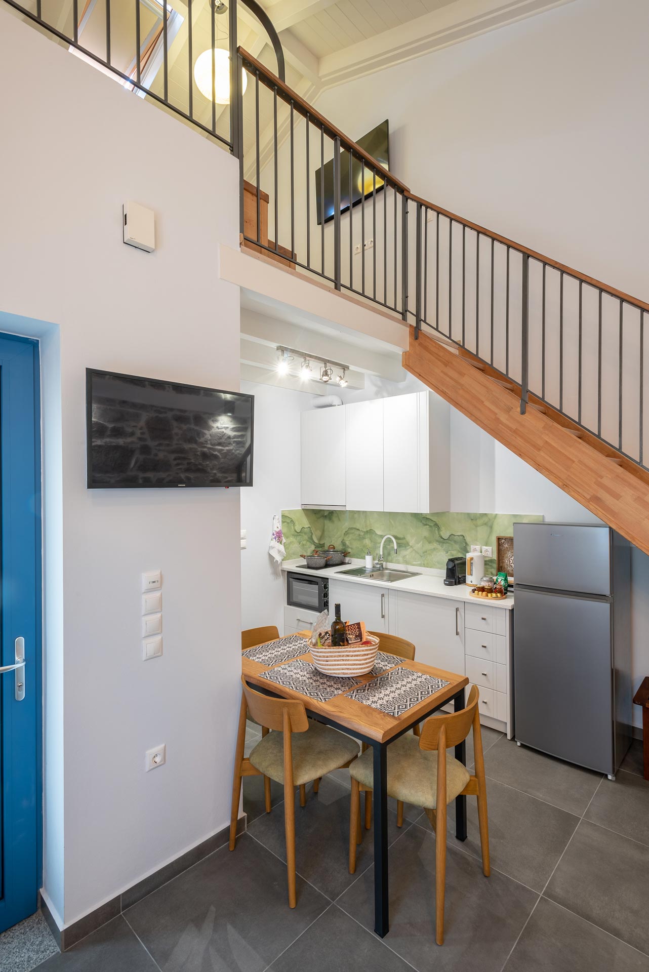 Internally the space is designed for a pleasant and comfortable stay. On the ground floor is the dining room, kitchen, toilet, large sofa, TV