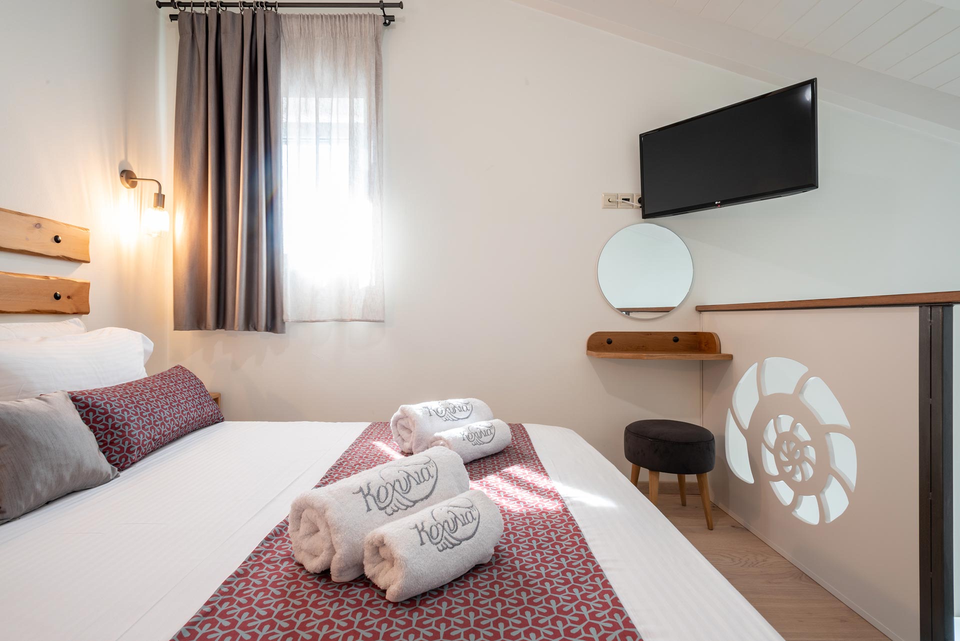 Smaragdia, in shades of green, can accommodate up to four people in one double and two single beds.